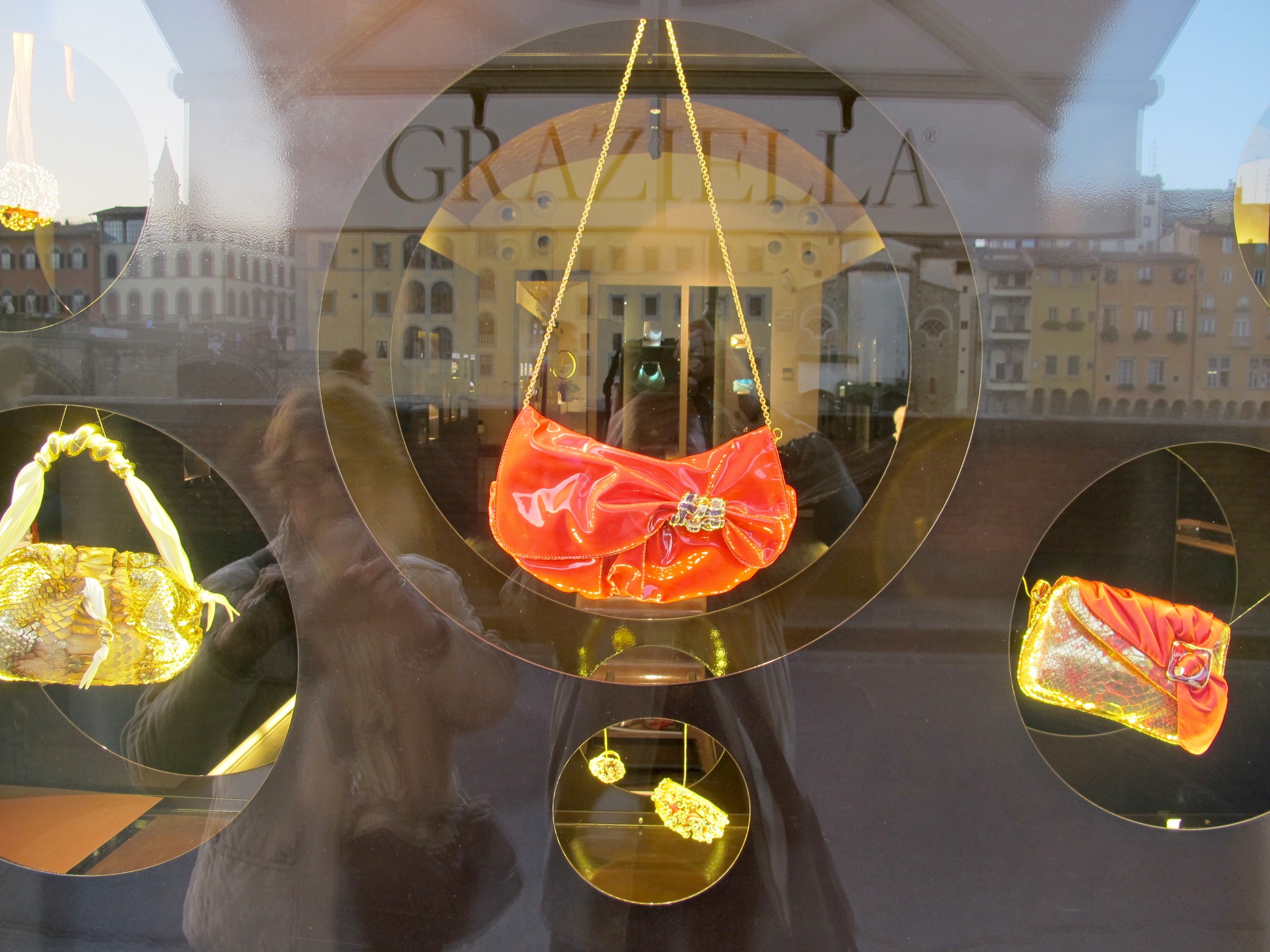 Paseando por la orilla izquierda del Arno en Florencia, ciudad reconocida, entre otras muchas cosas relacionadas con el arte, por sus diseños y trabajos con la piel, cuando nos paramos ante el escaparate de una tienda de bolsos. El diseño de aquellos objetos, su brillo y belleza nos atrajo de forma particular. Aún sabiendo que los reflejos me causarían una mala pasada si tomaba una foto, me arriesgué. El resultado es una composición muy curiosa: desde luego se pueden ver los bolsos, el nombre de la tienda, nosotros tomando la foto y lo mejor, la orilla derecha del rio Arno, todo en una sola instantánea.
