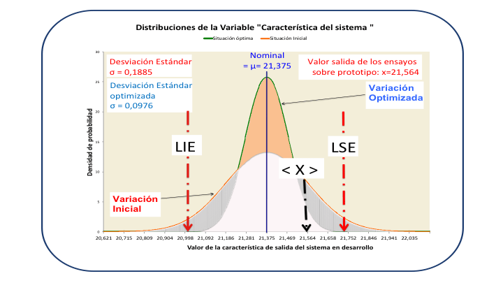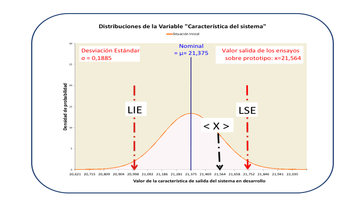 El ejemplo de la figura 2 representa la situación descrita en el párrafo anterior. El sistema en el ensayo del prototipo obtiene una dimensión x = 21,564. Esta salida es considerada como aceptable ya que entra perfectamente dentro del campo de especificación. Lo que no se está considerando, en esta decisión, es que el valor 21,564 podría, también, pertenecer a una distribución que no es aceptable ya que las colas, valores extremos, se salen de los límites
