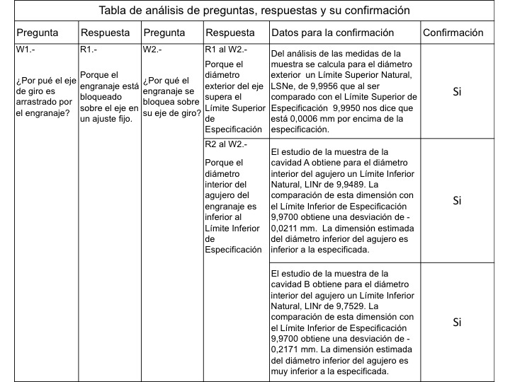 Para facilitar el estudio de la confirmación de los potenciales Por Qué y sus respuestas se prepara la tabla que sigue basada en los 5W o Por Qué definidos previamente y en los datos reales ya expuestos.
