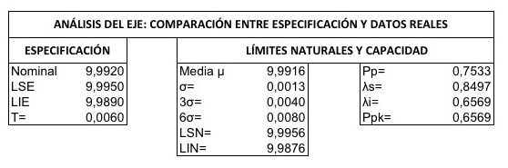 Con esta normalidad se puede concluir que el proceso no es capaz, el Pp es < 1,00 y, en consecuencia producirá piezas fuera de especificación por ambos límites. La estimación de los Límites Naturales del eje es aceptable lo que proporcionará una buena aproximación a los cálculos de holgura e interferencia.