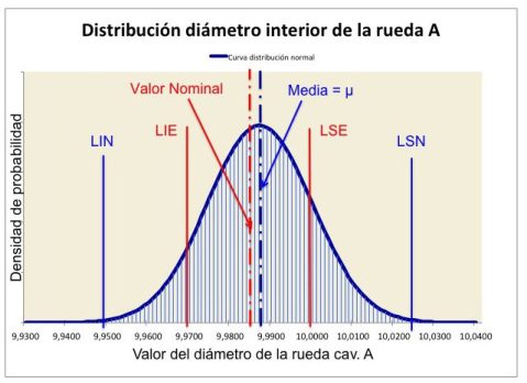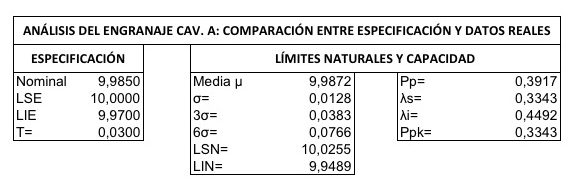 Se puede concluir que el proceso no es capaz, el Pp es < 1,00 y, en consecuencia producirá piezas fuera de especificación. Dada la asimetría de la distribución la estimación de los Límites Naturales del engranaje, en su cavidad A, deja de ser correcta. Puesto que presenta un sesgo positivo la estimación que se haga de la holgura y la interferencia pasa a ser aproximada, aunque para el objetivo del problema las conclusiones que se obtengan serán suficientes.