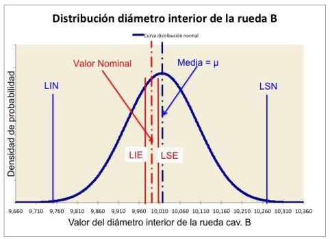 Se puede concluir que el proceso no es capaz, el Pp es muy inferior a 1,00 y, en consecuencia producirá gran número de piezas fuera de especificación por ambos límites. Dada la asimetría de la distribución la estimación de los Límites Naturales del engranaje, en su cavidad B, deja de ser correcta, puesto que presenta un sesgo negativo acusado la estimación que se haga de la holgura y la interferencia pasa a ser aproximada, aunque para el objetivo del problema las conclusiones que se obtengan serán suficientes.